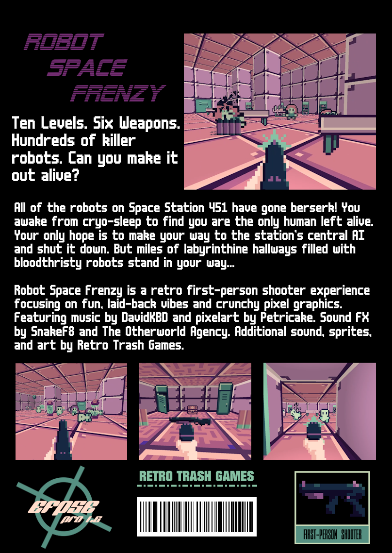Robot Space Frenzy is a retro FPS lovingly referred to by its creator as a "casual boomer shooter." The sense of speed and gunplay are meant to recall classics like Doom and Heretic, but more laid-back when it comes to difficulty.